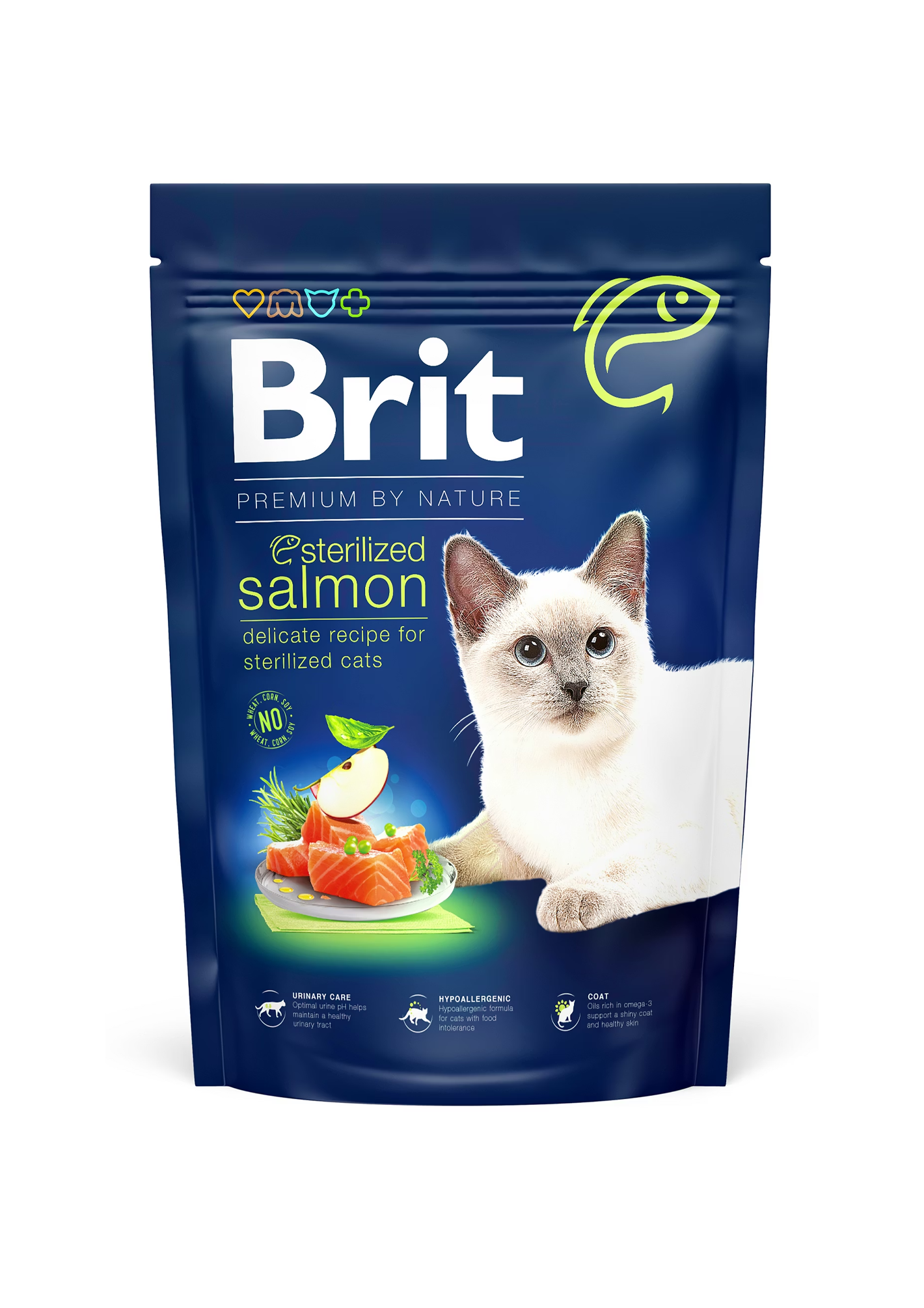 – Delicate recipe for sterilized cats, made from natural ingredients for every day healthy nutrition. Tempting and appetizing. – No wheat, corn, soy. – Nutritional benefits: urinary care, hypoallergenic, coat, taurine. Brit Premium by Nature Cat Sterilized Salmon is a delicate recipe for sterilized cats with demanding coat care made from natural ingredients. Its produced from a high-quality salmon and other omega-3 rich ingredients to support the shine and thickness of the coat. The recipe is enriched with a variety of veggies, fruits, omega-3 rich oils, vitamins, and minerals for healthy digestion, strong teeth, bones, and overall vitality. Balanced pH and minerals contribute to the health of urinary system. Natural antioxidants and prebiotics contribute to the strenghtening of the immunity. The recipe is enriched with taurine, an essential aminoacid for cats. BPC recipes do not contain typical cereals such as wheat, corn, and soy.