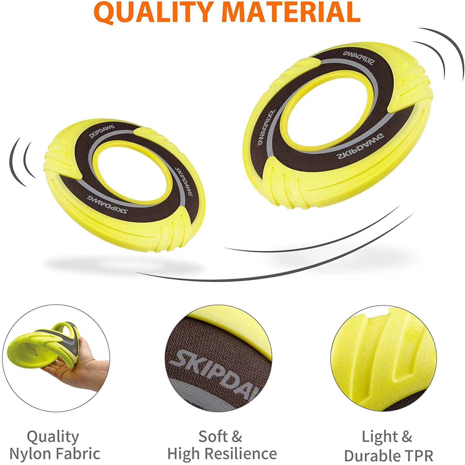 - NON-SLIP NYLON DESIGN & SAFE ON TEETH: This dog flying ring features a non-slip nylon interior soft rubber edges which is safe on your dog’s teeth. As with any dog toy, always supervise your pet while playing.