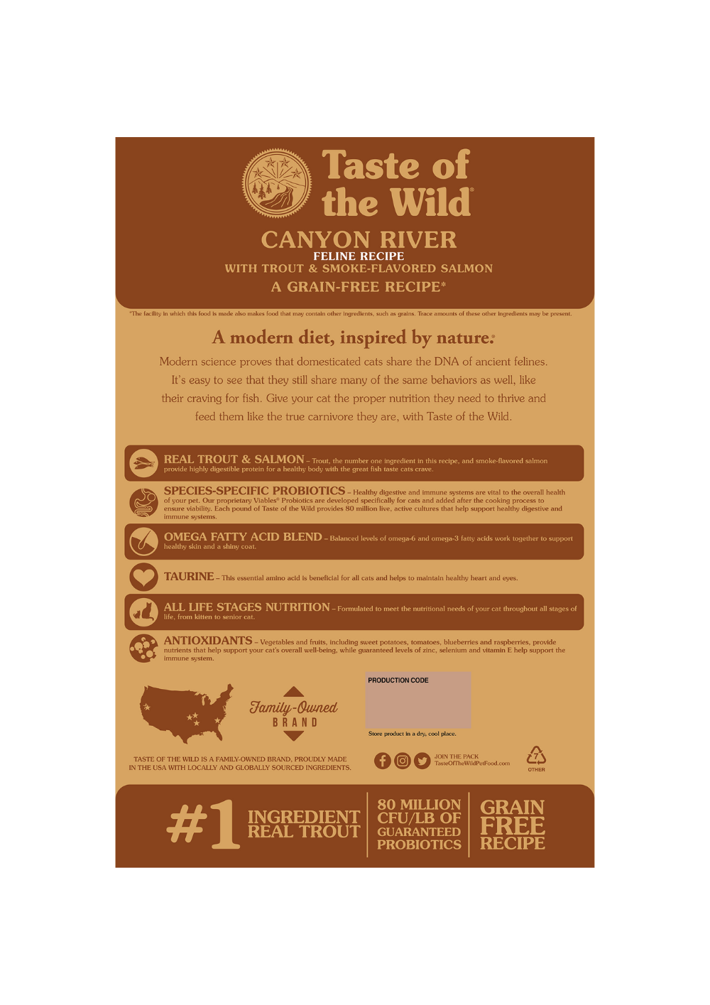 Healthy digestive and immune systems are vital to the overall health of your pet. Our proprietary Viables Probiotics are developed specifically for cats and added after the cooking process to ensure viability. Each pound of Taste of the Wild provides 80 million live, active cultures that help support