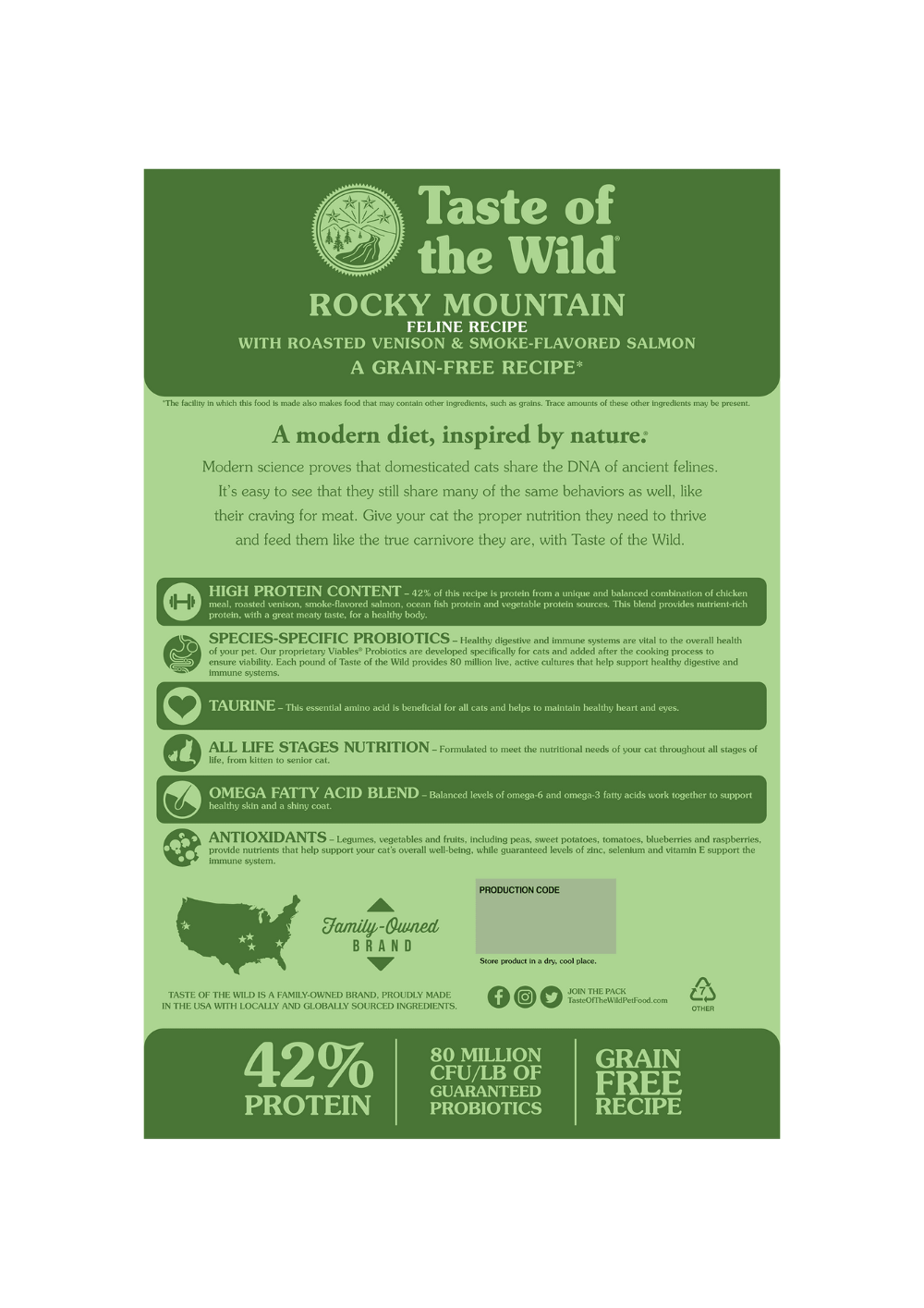Healthy digestive and immune systems are vital to the overall health of your pet. Our proprietary Viables Probiotics are developed specifically for cats and added after the cooking process to ensure viability. Each pound of Taste of the Wild provides 80 million live,